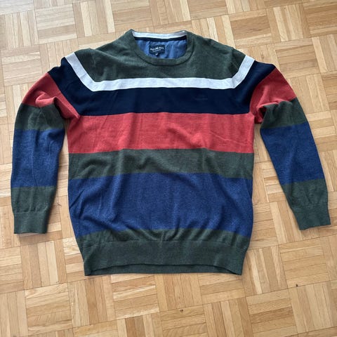 Gant genser for herre i størrelse XL. Genseren er laget av bomull og har brede grønne og mørke striper. Rund hals og lange ermer. Diskré Gant-logo på brystet. Passer til hverdagsbruk og kan kombineres med både jeans og chinos.