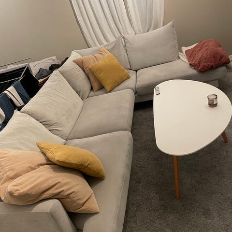 Ingen bruksmerker eller synlig slitasje. Trekket på putene (best dark grey) kan tas av og vaskes. Veldig komfortabel å sitte i.