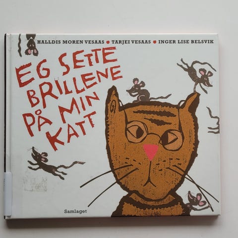Arosenius, Ivar sin billedbokklassiker om Vesla som rir ut i verden på katteryggen. De møter både hanen, grisen, gåsa og fisken + mange andre dyr. Oversatt av H. Wildenvey. Tekstilryggbind, org. kartongbind. Forord av Jo Tenfjord. Gjennomillustrert i farger og sort/hvitt.
