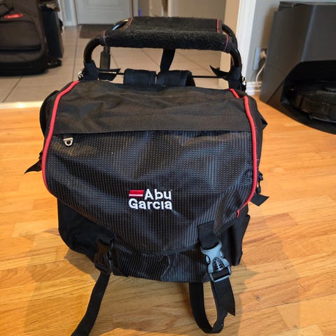 Abu Garcia og DAM fiske- og tursekker i svart og grønn farge. Sekkene har flere rom og lommer med spenner og glidelås for organisering av utstyr. sekkene er kombinert med sammenleggbare stoler/rammer, egnet for fiske og andre friluftsaktiviteter der man ønsker både oppbevaring og sittemulighet. Passer til bruk på tur, jakt og fiske der det er behov for å bære med seg utstyr på ryggen.