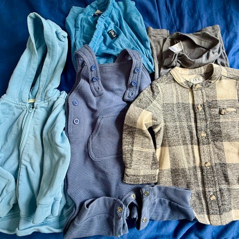 Ukjent merke barneklær pakke med meh kaer. Alt i størrelse 80, unisex. Pakken inneholder ulike typer klær og yttertøy i flere farger, inkludert gensere, jakker, bukser og regn- eller gummistøvler. Klærne passer til barn rundt størrelse 80 og består av forskjellige materialer egnet for utebruk.