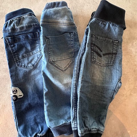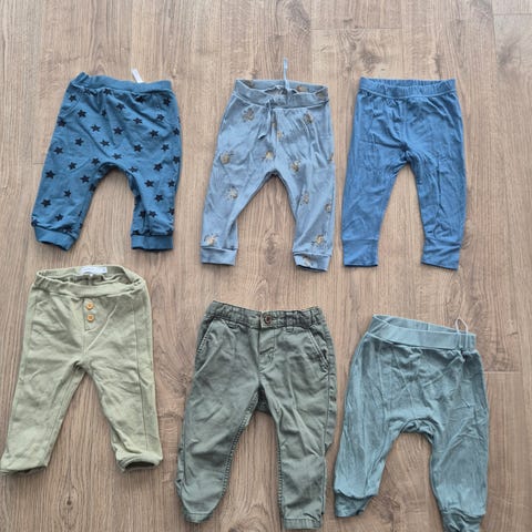 Fem bukser i str 68 selges samlet for 50 kr. Noe nupper på et par av buksene, selges derfor billig. Ellers ingen anmerkninger.