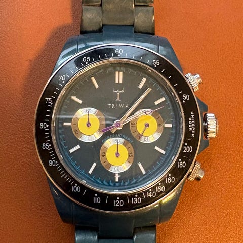 Triwa klokke for unisex med gullfarget urkasse og lys urskive. Leveres med svart skinnrem og ekstra gullfarget mesh-lenke, samt verktøy for å bytte rem. Passer til daglig bruk og mer formelle anledninger. Pent brukt. Trenger nytt batteri.