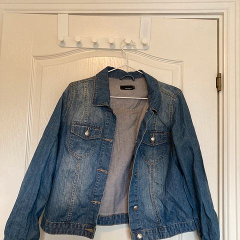 Monki jakke for dame i størrelse L. Jakken er blå og laget av bomull. Klassisk denimstil med krage, knappelukking foran og brystlommer med klaff. Ermene har mansjetter med knapp. Egnet som ytterjakke i overgangssesonger eller som et lag over andre plagg.