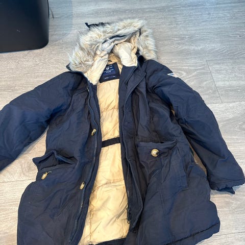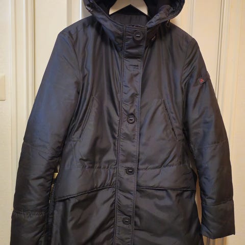 Blå parkas str 44 (italiensk) tilsvarer liten 38. Jakken er fylt med gåsedun. Fra kvalitetsmerket Peuterey. Fin slank modell.
