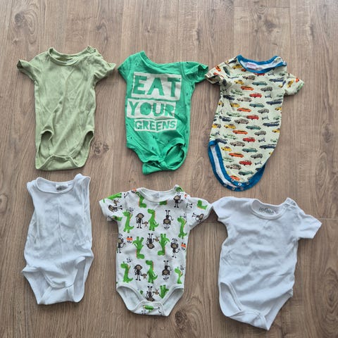 Tre kortermede bodyer i str 74 selges samlet for 80 kr. Pent brukt, ingen anmerkninger.
