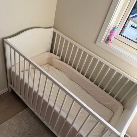 BRIO sprinkelseng i hvit utførelse. Klassisk barneseng med sprosser på alle sider. Sengen har justerbar bunn (vanlig funksjon på denne typen seng), og passer til standard madrassstørrelse for sprinkelseng. Bildene viser også madrass fra Dreamzone med avtagbart trekk med glidelås. Det er noe slitasje og merker på kanten av sengen, se nærbilder for tilstand. Egner seg som seng til baby og småbarn på barnerommet eller som ekstra seng hos besteforeldre.