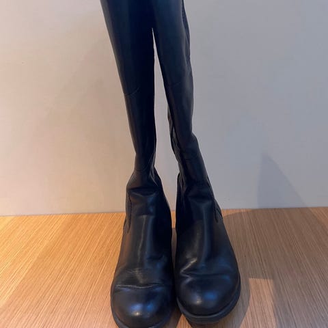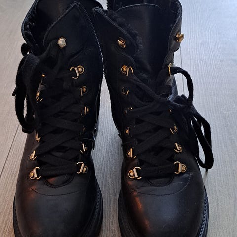 Tamaris støvler i størrelse 40. Støvlene er svarte med snøring foran og kraftig, rillet såle. Metallhemper til lissene gir et robust uttrykk. Egnet til hverdagsbruk i kjøligere vær. Firma Weekend
