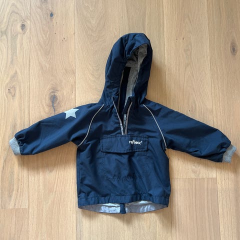 Reflex anorakk for barn i størrelse 98. Jakken er blå og laget i polyester. Modellen har hette, lang glidelås bak på ryggen og stor lomme på magen. Ermene har strikk ved håndleddene for bedre passform. Unisex-modell som passer både gutter og jenter.