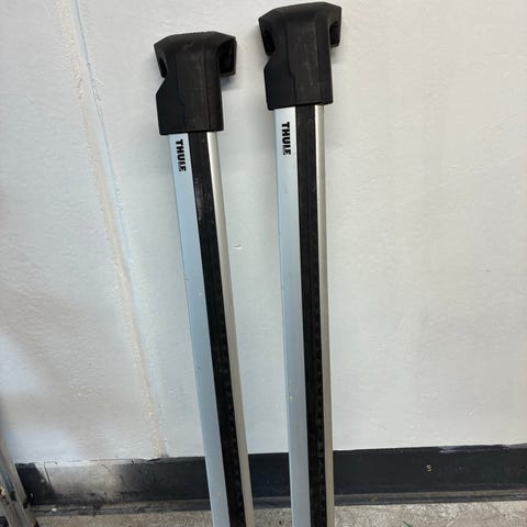 Thule takstativ med to lastebøyler i svart. Bøylene har integrert spor for feste av tilbehør og låsbare endestykker. Egnet for montering på bilens takrails eller festepunkter, avhengig av riktig monteringssett for aktuell bilmodell. Har frem til nå stått på en Volvo XC60, 2018 modell.