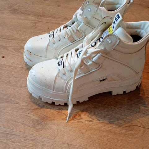 Buffalo sneakers/joggesko i størrelse 39. Modellen har kraftig, høy såle og overdel i hvitt materiale med snøring foran. Skoene har Buffalo-logo på tunge, side og hæl. Passer til hverdagsbruk og fritid.