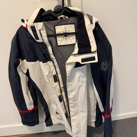 Dette er en Henri Lloyd seilerjakke, designet for kyst- og jolleseiling med vanntette sømmer og høy krage. Må kanskje impregneres på nytt, er nyvasket, kommer fra et dødsbo og har noe små flekker.