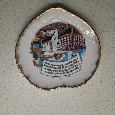 Lite trauformet fat/ skål i porselen ca 10 x 12,5 cm med gullkant og rødt dekorpynt. Motivet viser by- og folkeliv fra Stavanger med teksten " Hilsen Stavanger " Typisk fra 1900- tallet. Fint til smykker, nøkler eller som pyntegjenstander.