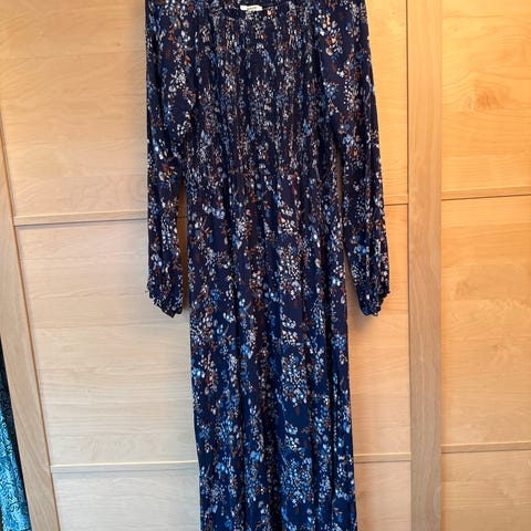 Moods of Norway festkjole for dame i størrelse 38. Lang kjole i svart polyester med lyst blomster- og planteprint. Modellen har lange ermer, rund hals og markert midje med rynket skjørt som gir vidde. Egnet som penkjole til ulike anledninger.