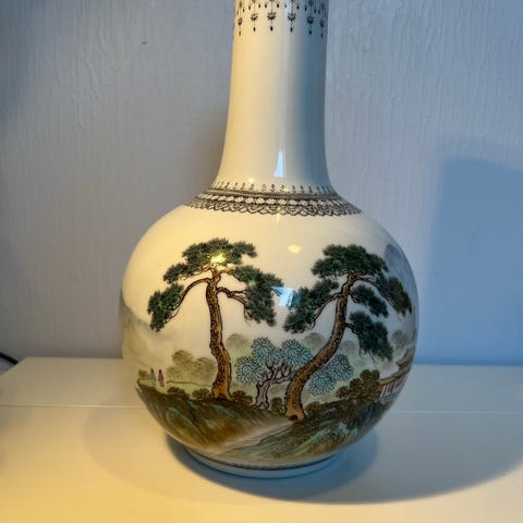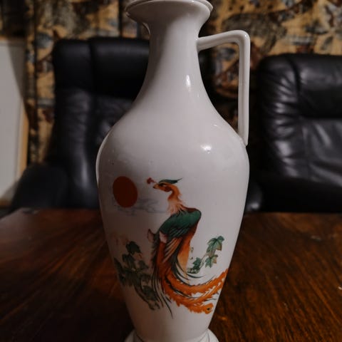 Porselensvase i hvit glasur med dekor av fargerik fugl og sol på forsiden. Vasen har smal hals, helletut og vinklet hank. Passer som pyntegjenstand eller til mindre blomsteroppsatser. Merking med asiatisk skrift på baksiden.