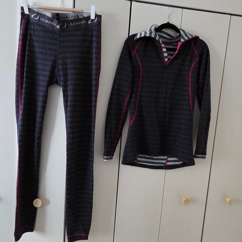 Ulvang ullundertøy sett for dame i størrelse S. Settet består av overdel med rosa/grå striper og underdel mørkegrå/lysegrå striper. Materialet i ull gir god isolasjon og temperaturregulering. Passer som innerste lag ved tur, trening og annen utendørs aktivitet. Godt brukt, men ingen bruksmerker.