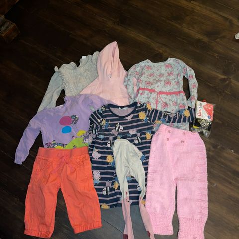 barneklær til våren for jente i størrelse 98/104, i flere farger. Pakken inneholder ulike plagg som over- og underdeler, inkludert gensere, bukser og eventuelt tilbehør, i forskjellige farger og mønstre. Klærne passer til hverdagsbruk for barn rundt størrelse98/ 104. Klærne er bla fra POP, arket, hmEgnet som basisgarderobe til barnehage og fritid.