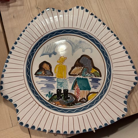 Dekorativt, håndmalt veggfat i keramikk ca 30 x 30 cm. Motiv av to personer under et tre. Fargerikt og detaljrikt med blader, blomster og prikkdekor i grønt og gult. Fatet er firkantet med avrundede kanter og har oppheng bak for veggmontering.