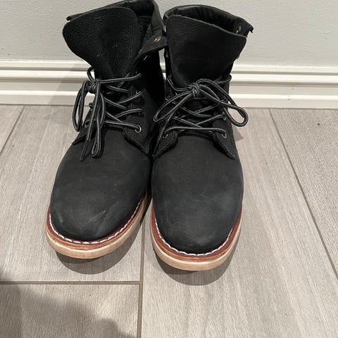 Birkenstock vinterstøvler i størrelse 44. Støvlene er i svart semsket skinn med snøring foran og hempe bak på skaftet for enklere av- og påtaking. Yttersålen er i gummi med grovt mønster for bedre grep. Modellen har ankelhøyt skaft og nøytral, enkel design som passer til hverdagsbruk i kaldere vær.