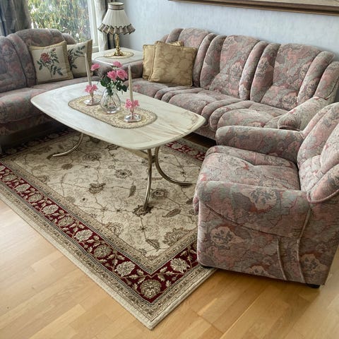 Fin gammel sofa og 2 stoler i lyse rosa brokade mønstret stoff. med tungt og marmorbord plate og sokkel/bein.
