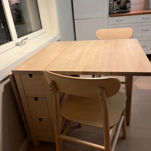 IKEA klaffbord i hvit utførelse. Bordet har to nedfellbare klaffer som gjør at det kan brukes både som lite konsollbord og som større bordflate ved behov. I midtdelen er det integrert oppbevaring med flere skuffer. Egnet som spisebord eller arbeidsbord i rom med begrenset plass, for eksempel kjøkken, stue eller hybel.