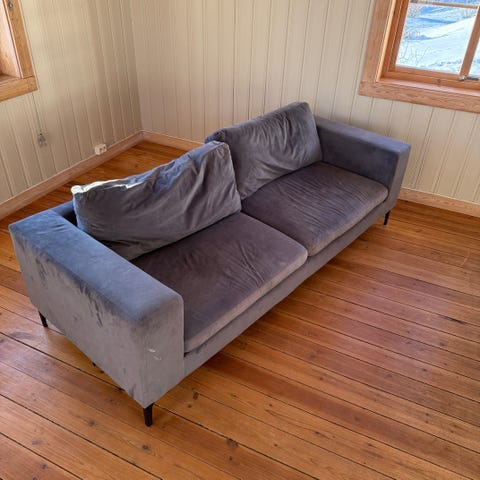 Meget pent brukt veloursofa gis bort mot henting. Ingen synlige flekker eller falming. Farge oliven. Dekorasjonsbånd har løsnet og må limes på igjen. Ingen andre skader.