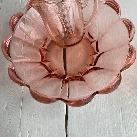 Dette er et antikt fløtesett i rosa pressglass fra Fenne, ofte omtalt som "Depression glass" med Art Deco-trekk fra cirka 1938.
