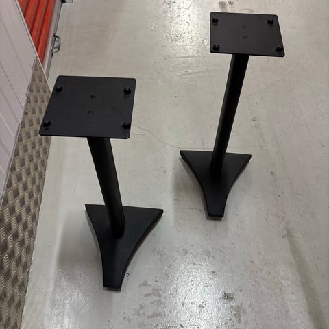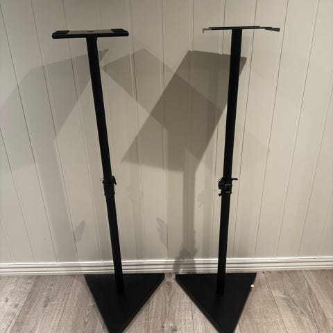 Høyttaler stativer av god kvalitet fra kjent merke med solid tyngde og spikes oppe og nede. Fortjener en vask og vil bli tørket over før ny eier får dem. Kom gjerne med bud om dere mener prisen er feil, men må ikke selge