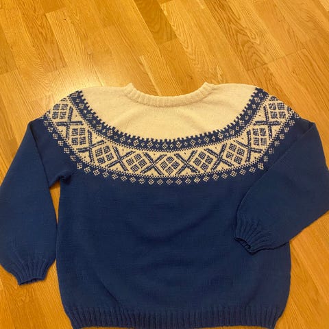 Strikket i mørkeblå og offwhite ullgarn.