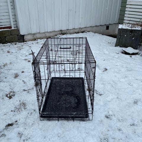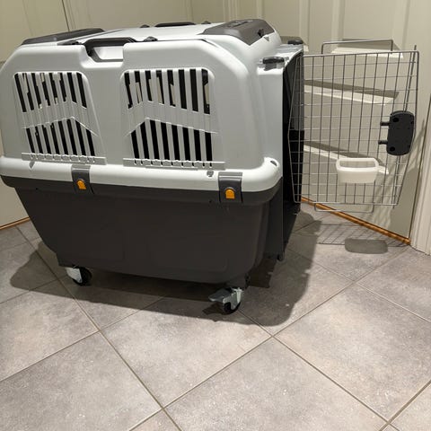 Hundebur og korg gis bort. Ene buret er sammenleggbart.