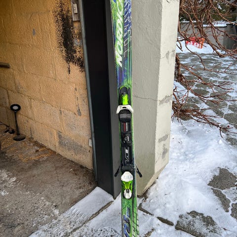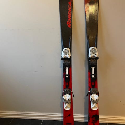 Nordica twin tip ski med bindinger. Skiene har overflate i svart og rød farge med Nordica-logo på framsiden. Lengde 119 cm