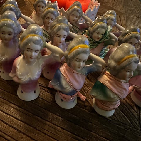 Porselensfigurer med motiv av barn og kvinner i tradisjonelle klær. Figurene er flerfargede og står på små sokler. Egner seg som pynt i hylle, vitrineskap eller på bord. Kan brukes samlet som serie eller hver for seg som dekorative elementer i interiøret.