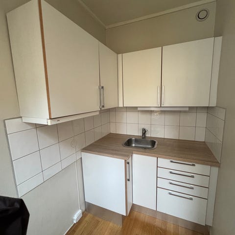Vasken, kranen og benkeplaten gis også bort, men benkeplaten er større en skapområdet fordi den også dekker en vaskemaskinen (som ikke gis bort).