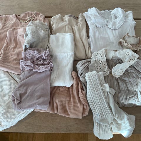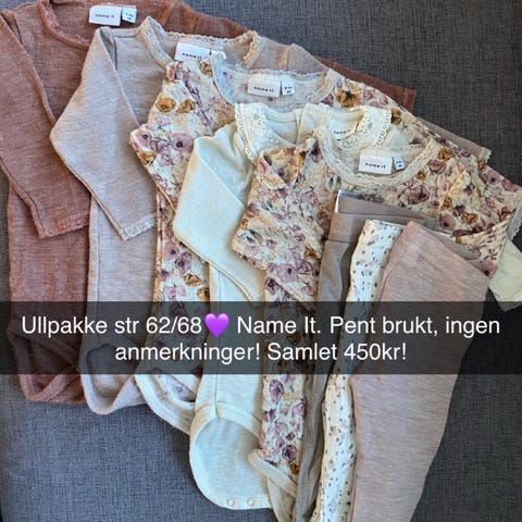 Inneholder 3 sett body og bukse/strømpebukse og 2 ulldresser, alt kjøpt nytt av meg og pent brukt.