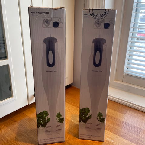 Emerio blender med to tilhørende drikkeflasker. Blenderen har base i rød og hvit farge, og leveres med to gjennomsiktige flasker med lokk. Produktet er egnet til tilberedning av smoothies, shakes og andre drikker som kan tas med på farten. Flaskene kan festes direkte på blenderbasen for miksing og deretter brukes som drikkeflasker.