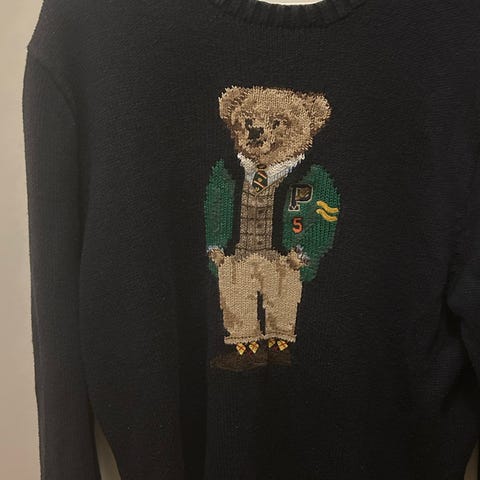 Selger en helt ny Polo Ralph Lauren Yankees Bear Sweater i fargen Navy Combo. Genseren har ikonisk “Polo Bear” i Yankees-uniform (strikket motiv) og kommer med originale merkelapper (se bilde). Klassisk passform og høy kvalitet – perfekt til høst/vinter eller som gave.
