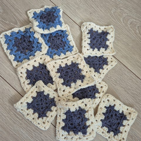 Heklede granny squares garnlapper små ruter rosa og hvit