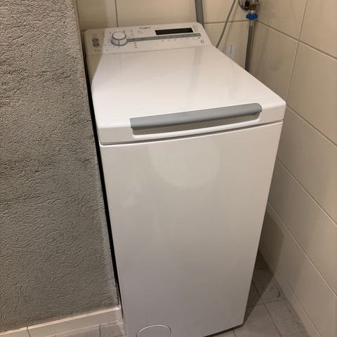 Whirlpool toppmatet vaskemaskin med kapasitet på 7 kg. Maskinen er hvit og har toppmating som gjør den egnet der det er begrenset plass foran maskinen.