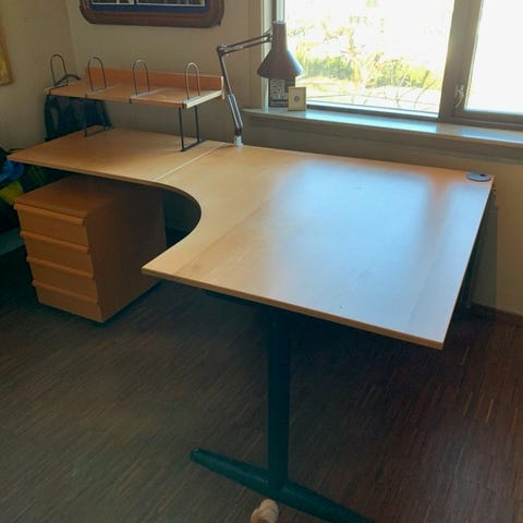 Skrivebord i hjørneløsning med grå bordplate. Bordet har L-form som gir god arbeidsflate og passer til kontor eller hjemmekontor.