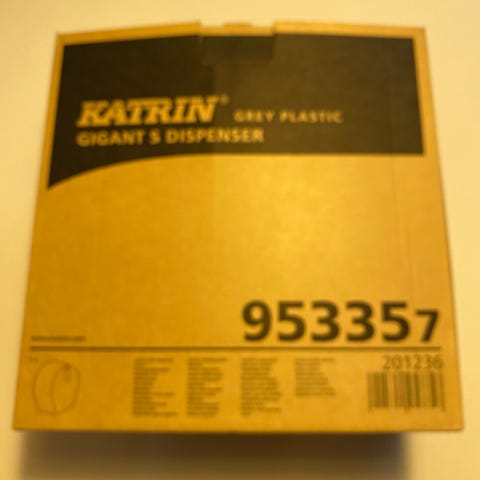 Katrin Gigant L dispenser for toalettpapir i svart farge. Modellen er tilpasset Gigant L-toalettpapirruller og er beregnet for veggmontering på toalett- og baderom. Dispenseren har lokk som kan åpnes for enkel påfylling og utskifting av ruller, samt innvendig holder for rullen som sikrer jevn avrulling av papiret. Egnet for bruk på offentlige toaletter, kontorer og andre fellesarealer der det er behov for stor kapasitet på toalettpapirdispenser.
