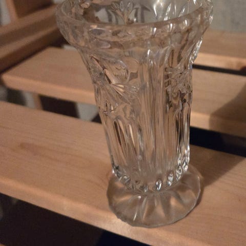 Glassvase i klart glass med inngravert motiv av figur. Vasen har konisk form med bred åpning og smalere bunn. Passer til mindre blomsteroppsatser eller som dekorasjonsgjenstand på bord eller hylle.