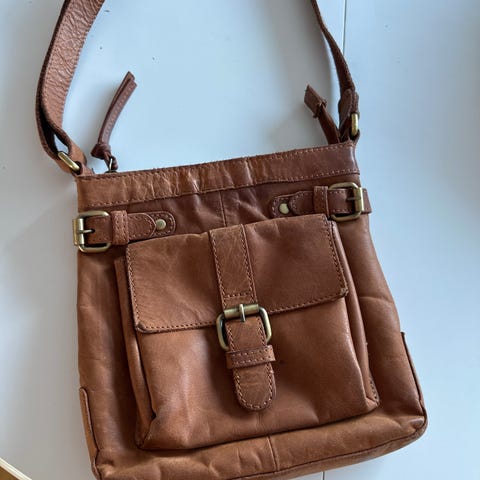 Vesken har et veldig fint skinn, som er behandlet på en måte at det gir vesken en flott patina. Den har lang, regulerbar skulderrem, to lommer på forsiden av vesken og ett stort med glidelås på baksiden. Innvendig er det også flere rom, se bilder. Den er 26 cm høy og 26 cm bred.