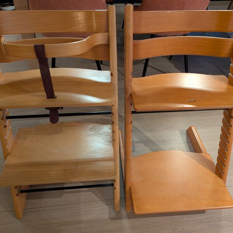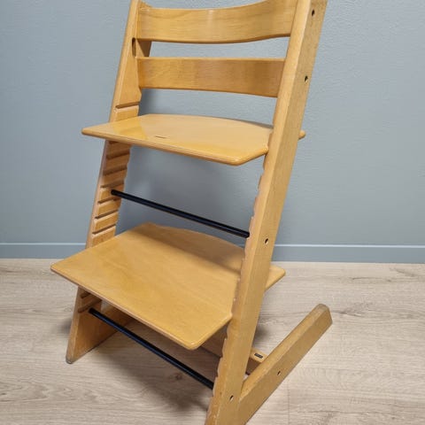 Stokke Tripp Trapp høy barnestol i svart tre med justerbart sete og fotbrett. Stolen er utstyrt med bøyle/frontbøyle i plast og polstret sitte- og ryggpute med mønster i nøytrale farger. Høyden på sete og fotbrett kan reguleres etter barnets størrelse, slik at stolen kan brukes over flere år ved spisebord eller annet bord. Passer til småbarn som trenger støtte fra bøyle og pute, og kan senere tilpasses større barn ved å justere eller fjerne tilbehør etter behov.