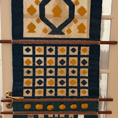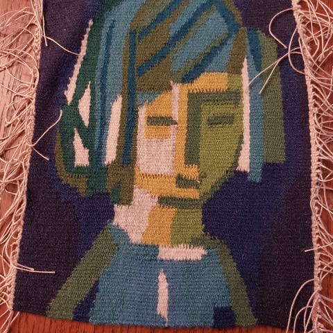 Veggteppe i ull med vevd motiv av en kvinne i lys kjole omgitt av blomster og planter. Teppet har flerfargede felt i blant annet blå, grønn, rosa, hvit og beige toner. Langs kortsidene er det frynser. Egner seg som veggdekor i stue, gang eller soverom. 45 x 32 cm