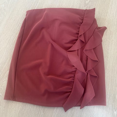 Pull&Bear skjørt for dame i størrelse L men passer også til M. Skjørtet er mer i terracota farge og laget av polyester (elastisk skjørt har god stretch). Passer til hverdagsbruk eller enklere penere anledninger.