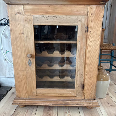 Dette vinskapet i tre i gårdshusstil har en slitt hvit overflate, en toppskuff, et oppbevaringsskap og plass til flere flasker.