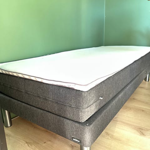IKEA seng med hodegavl i grått tekstiltrekk. Sengen består av en madrass med overmadrass på en grå sengebunn med ben. Nøytral farge som passer inn i de fleste soverom. Egnet som fast seng i soverom eller gjesterom.
