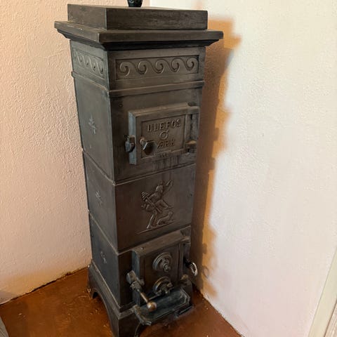 Gammel Vedovn i støpejern i svart utførelse.