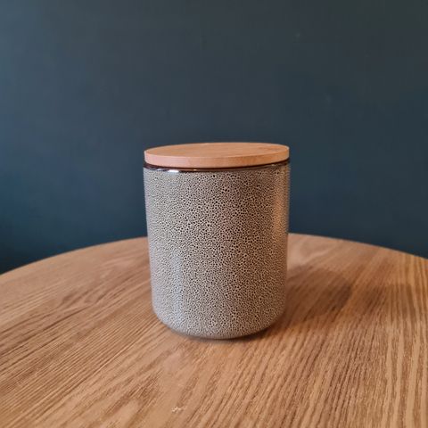 Liten søt lite brukt krukke med trelokk, selges.