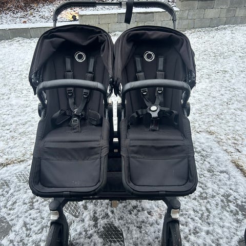 Bugaboo duo/tvillingvogn i svart tekstil. Vognen har to separate sittedeler ved siden av hverandre, hver med justerbar rygg og fempunktssele. Forhjulene er svingbare for enklere manøvrering, og bakhjulene er større for bedre stabilitet. Justerbart håndtak og fotbrett gir mulighet for tilpasning til barnas behov. Egnet for to barn som kan sitte i sportsdel.